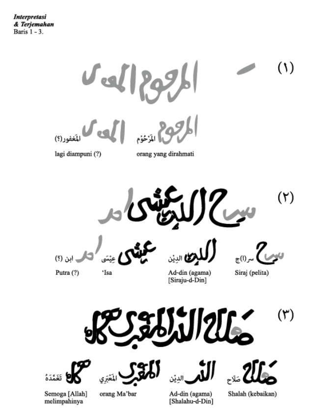 Identitas yang terukir pada batu nisan Sirajuddin Isa memberikan wawasan berharga. Nama "Siraju-d-Din" yang berarti "Cahaya Agama" mencerminkan status tinggi dan peran signifikan almarhum sebagai pemimpin spiritual dalam komunitas Muslim Tuban kala itu. Inskripsi tersebut juga mengidentifikasi ayahnya, Shalahu-d-Din Al-Ma'bariy, yang berasal dari wilayah Ma'bar di Tamil Nadu, India. Penyebutan asal-usul ayah ini merupakan bukti arkeologis yang sangat penting dan langka, yang menunjukkan konektivitas Tuban dengan pusat-pusat perdagangan dan keagamaan Islam di dunia, seperti Samudra Pasai dan Barus.