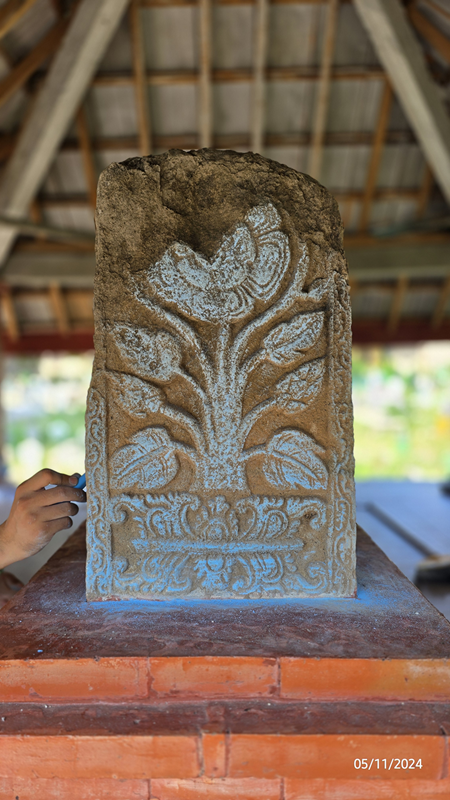 Batu nisan ini juga dihiasi dengan motif floral indah yang melambangkan kehidupan abadi dan surga. Yang istimewa adalah adanya ornamen padmasana (teratai) di bawah bunga, sebuah simbol yang dalam tradisi Hindu-Buddha Jawa digunakan pada candi-candi raja, melambangkan pencapaian spiritual tertinggi.