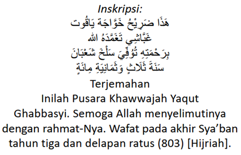Nisan epigrafis yang ditemukan ini mengidentifikasi makam sebagai Dharih (pusara/makam berstruktur) milik seorang tokoh bernama Khawwajah Yaqut Ghabbasyi. Berdasarkan inskripsinya, almarhum wafat pada akhir bulan Sya'ban tahun 803 Hijriah, yang bertepatan dengan sekitar 22 April 1401 Masehi. Tanggal